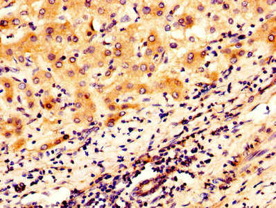 IHC image of CSB-PA016314LA01HU diluted at 1:300 and staining in paraffin-embedded human liver cancer performed on a Leica BondTM system. After dewaxing and hydration, antigen retrieval was mediated by high pressure in a citrate buffer (pH 6.0). Section was blocked with 10% normal goat serum 30min at RT. Then primary antibody (1% BSA) was incubated at 4°C overnight. The primary is detected by a biotinylated secondary antibody and visualized using an HRP conjugated SP system.