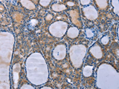 • The image on the left is immunohistochemistry of paraffin-embedded Human thyroid cancer tissue using CSB-PA924414(OPTN Antibody) at dilution 1/25, on the right is treated with fusion protein. (Original magnification: ×200)