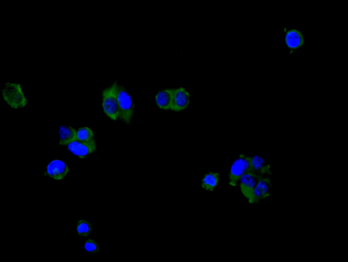 Immunofluorescence staining of MCF-7 cell with CSB-PA837442LA01HU at 1:600, counter-stained with DAPI. The cells were fixed in 4% formaldehyde and blocked in 10% normal Goat Serum. The cells were then incubated with the antibody overnight at 4C. The secondary antibody was Alexa Fluor 488-congugated AffiniPure Goat Anti-Rabbit IgG(H+L).