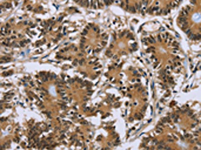 The image on the left is immunohistochemistry of paraffin-embedded Human colon cancer tissue using CSB-PA548912(P2RY1 Antibody) at dilution 1/40, on the right is treated with synthetic peptide. (Original magnification: ×200)