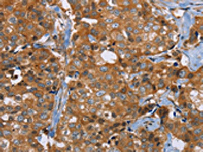 The image on the left is immunohistochemistry of paraffin-embedded Human breast cancer tissue using CSB-PA548912(P2RY1 Antibody) at dilution 1/40, on the right is treated with synthetic peptide. (Original magnification: ×200)