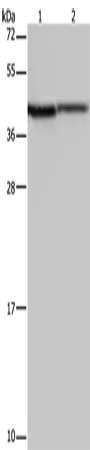 Gel: 10%SDS-PAGE, Lysate: 40 μg, Lane 1-2: A549 cells, mouse liver tissue, Primary antibody: CSB-PA548912(P2RY1 Antibody) at dilution 1/200, Secondary antibody: Goat anti rabbit IgG at 1/8000 dilution, Exposure time: 30 seconds