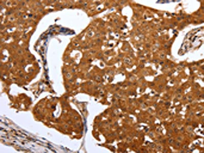 The image on the left is immunohistochemistry of paraffin-embedded Human liver cancer tissue using CSB-PA966699(PARP1 Antibody) at dilution 1/20, on the right is treated with synthetic peptide. (Original magnification: ×200)
