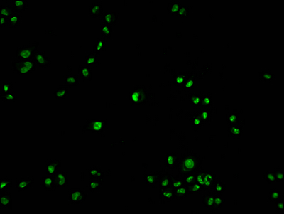 • Immunofluorescence staining of Hela cells with CSB-PA017457LA01HU at 1:100, counter-stained with DAPI. The cells were fixed in 4% formaldehyde and blocked in 10% normal Goat Serum. The cells were then incubated with the antibody overnight at 4°C. The secondary antibody was Alexa Fluor 488-congugated AffiniPure Goat Anti-Rabbit IgG(H+L).