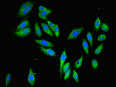 • Immunofluorescent analysis of Hela cells using CSB-PA017467ESR2HU at dilution of 1:100 and Alexa Fluor 488-congugated AffiniPure Goat Anti-Rabbit IgG(H+L)