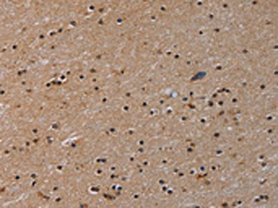 The image on the left is immunohistochemistry of paraffin-embedded Human brain tissue using CSB-PA232889(PARP8 Antibody) at dilution 1/40, on the right is treated with synthetic peptide. (Original magnification: ×200)
