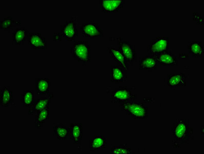 Immunofluorescent analysis of Hela cells using CSB-PA017489HA01HU at dilution of 1:100 and Alexa Fluor 488-congugated AffiniPure Goat Anti-Rabbit IgG(H+L)