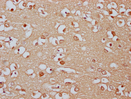 IHC image of CSB-PA897294LA01HU diluted at 1:300 and staining in paraffin-embedded human brain tissue performed on a Leica BondTM system. After dewaxing and hydration, antigen retrieval was mediated by high pressure in a citrate buffer (pH 6.0). Section was blocked with 10% normal goat serum 30min at RT. Then primary antibody (1% BSA) was incubated at 4°C overnight. The primary is detected by a Goat anti-rabbit IgG labeled by HRP and visualized using 0.05% DAB.