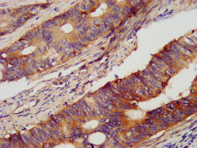 IHC image of CSB-PA017642LA01HU diluted at 1:400 and staining in paraffin-embedded human colon cancer performed on a Leica BondTM system. After dewaxing and hydration, antigen retrieval was mediated by high pressure in a citrate buffer (pH 6.0). Section was blocked with 10% normal goat serum 30min at RT. Then primary antibody (1% BSA) was incubated at 4°C overnight. The primary is detected by a biotinylated secondary antibody and visualized using an HRP conjugated SP system.