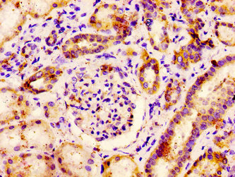 IHC image of CSB-PA017645LA01HU diluted at 1:400 and staining in paraffin-embedded human kidney tissue performed on a Leica BondTM system. After dewaxing and hydration, antigen retrieval was mediated by high pressure in a citrate buffer (pH 6.0). Section was blocked with 10% normal goat serum 30min at RT. Then primary antibody (1% BSA) was incubated at 4°C overnight. The primary is detected by a biotinylated secondary antibody and visualized using an HRP conjugated SP system.