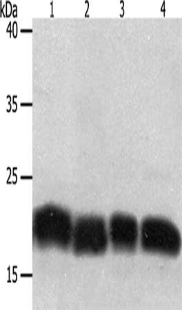Gel: 10+12%SDS-PAGE, Lysate: 50 μg, Lane 1-4: Jurkat cells, hela cells, human fetal lung tissue, A549 cells, Primary antibody: CSB-PA653643(PDCD6 Antibody) at dilution 1/200, Secondary antibody: Goat anti rabbit IgG at 1/8000 dilution, Exposure time: 1 minute