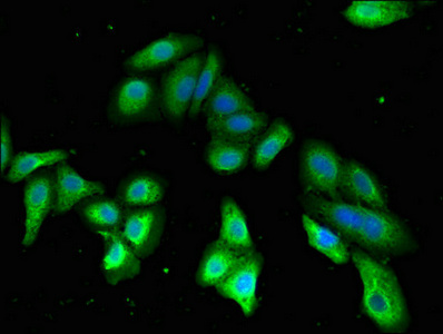 Immunofluorescent analysis of HepG2 cells using CSB-PA017687LA01HU at dilution of 1:100 and Alexa Fluor 488-congugated AffiniPure Goat Anti-Rabbit IgG(H+L)