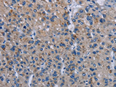The image on the left is immunohistochemistry of paraffin-embedded Human liver cancer tissue using CSB-PA309418(PDE4D Antibody) at dilution 1/20, on the right is treated with synthetic peptide. (Original magnification: ×200)