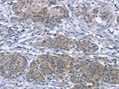 The image on the left is immunohistochemistry of paraffin-embedded Human cervical cancer tissue using CSB-PA137424(PDLIM2 Antibody) at dilution 1/20, on the right is treated with fusion protein. (Original magnification: ×200)