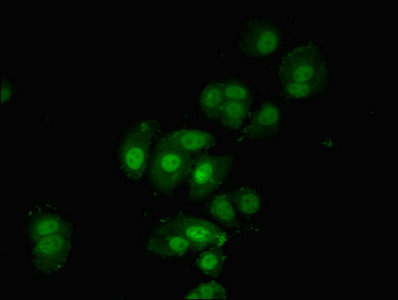 Immunofluorescent analysis of MCF-7 cells using CSB-PA017738ESR1HU at dilution of 1:100 and Alexa Fluor 488-congugated AffiniPure Goat Anti-Rabbit IgG(H+L)