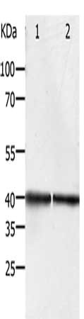 Gel: 10%SDS-PAGE, Lysate: 40 μg, Lane 1-2: Hela cells, Jurkat cells, Primary antibody: CSB-PA114989(PDX1 Antibody) at dilution 1/450, Secondary antibody: Goat anti rabbit IgG at 1/8000 dilution, Exposure time: 1 minute