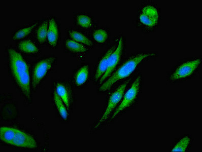 Immunofluorescent analysis of Hela cells using CSB-PA621865DSR2HU at dilution of 1:100 and Alexa Fluor 488-congugated AffiniPure Goat Anti-Rabbit IgG(H+L)