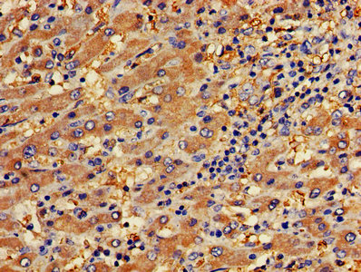 • IHC image of CSB-PA017767LA01HU diluted at 1:400 and staining in paraffin-embedded human liver cancer performed on a Leica BondTM system. After dewaxing and hydration, antigen retrieval was mediated by high pressure in a citrate buffer (pH 6.0). Section was blocked with 10% normal goat serum 30min at RT. Then primary antibody (1% BSA) was incubated at 4°C overnight. The primary is detected by a biotinylated secondary antibody and visualized using an HRP conjugated SP system.