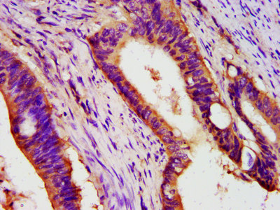 IHC image of CSB-PA767196LA01HU diluted at 1:400 and staining in paraffin-embedded human colon cancer performed on a Leica BondTM system. After dewaxing and hydration, antigen retrieval was mediated by high pressure in a citrate buffer (pH 6.0). Section was blocked with 10% normal goat serum 30min at RT. Then primary antibody (1% BSA) was incubated at 4°C overnight. The primary is detected by a biotinylated secondary antibody and visualized using an HRP conjugated SP system.