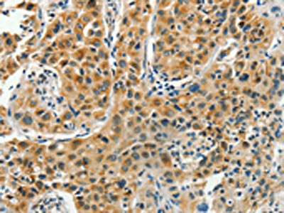 The image on the left is immunohistochemistry of paraffin-embedded Human lung cancer tissue using CSB-PA097824(PFDN6 Antibody) at dilution 1/35, on the right is treated with synthetic peptide. (Original magnification: ×200)