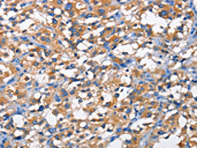 The image on the left is immunohistochemistry of paraffin-embedded Human thyroid cancer tissue using CSB-PA912667(PFKP Antibody) at dilution 1/50, on the right is treated with fusion protein. (Original magnification: ×200)