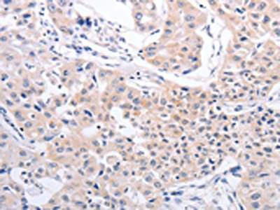 The image on the left is immunohistochemistry of paraffin-embedded Human lung cancer tissue using CSB-PA078303(PFN4 Antibody) at dilution 1/20, on the right is treated with fusion protein. (Original magnification: ×200)