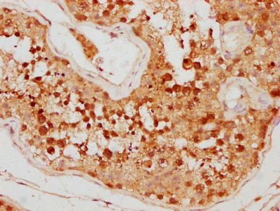 IHC image of CSB-PA822692LA01HU diluted at 1:500 and staining in paraffin-embedded human testis tissue performed on a Leica BondTM system. After dewaxing and hydration, antigen retrieval was mediated by high pressure in a citrate buffer (pH 6.0). Section was blocked with 10% normal goat serum 30min at RT. Then primary antibody (1% BSA) was incubated at 4°C overnight. The primary is detected by a biotinylated secondary antibody and visualized using an HRP conjugated SP system.