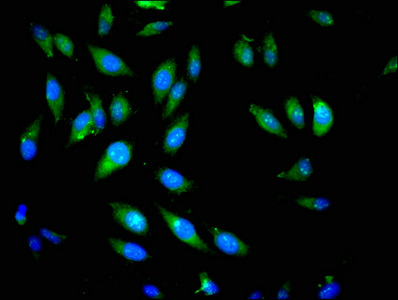 • Immunofluorescent analysis of Hela cells using CSB-PA017999LA01HU at dilution of 1:100 and Alexa Fluor 488-congugated AffiniPure Goat Anti-Rabbit IgG(H+L)