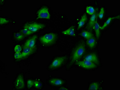 Immunofluorescence staining of Hela cells with CSB-PA850293LA01HU at 1:100, counter-stained with DAPI. The cells were fixed in 4% formaldehyde, permeabilized using 0.2% Triton X-100 and blocked in 10% normal Goat Serum. The cells were then incubated with the antibody overnight at 4°C. The secondary antibody was Alexa Fluor 488-congugated AffiniPure Goat Anti-Rabbit IgG(H+L).
