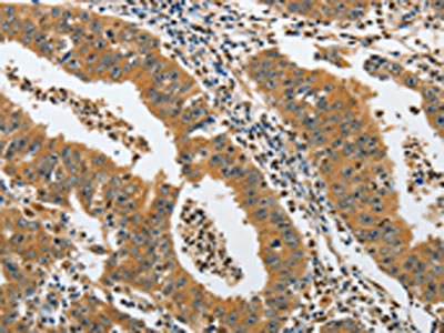 The image on the left is immunohistochemistry of paraffin-embedded Human colon cancer tissue using CSB-PA622420(PIK3R3 Antibody) at dilution 1/45, on the right is treated with synthetic peptide. (Original magnification: ×200)