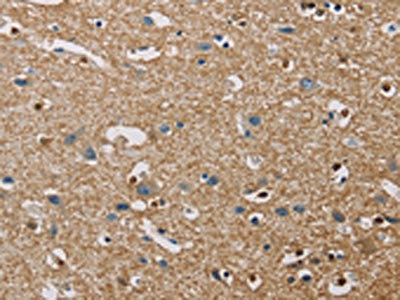 The image on the left is immunohistochemistry of paraffin-embedded Human brain tissue using CSB-PA180077(PIP4K2A Antibody) at dilution 1/40, on the right is treated with fusion protein. (Original magnification: ×200)