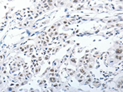 The image on the left is immunohistochemistry of paraffin-embedded Human lung cancer tissue using CSB-PA104347(PKD2 Antibody) at dilution 1/25, on the right is treated with synthetic peptide. (Original magnification: ×200)