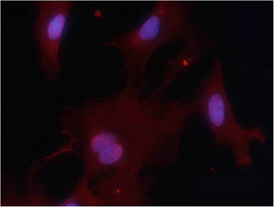 • Immunofluorescence staining of methanol-fixed MEF cells using PKM1 Antibody.