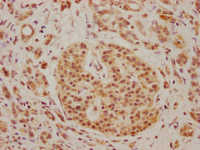 • IHC image of CSB-PA721207LA01HU diluted at 1:100 and staining in paraffin-embedded human pancreatic cancer performed on a Leica BondTM system. After dewaxing and hydration, antigen retrieval was mediated by high pressure in a citrate buffer (pH 6.0). Section was blocked with 10% normal goat serum 30min at RT. Then primary antibody (1% BSA) was incubated at 4°C overnight. The primary is detected by a biotinylated secondary antibody and visualized using an HRP conjugated SP system.