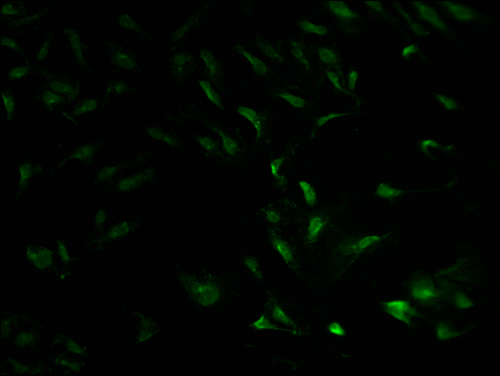 • Immunofluorescence staining of Hela cells with CSB-PA030070HA01HU at 1:100, counter-stained with DAPI. The cells were fixed in 4% formaldehyde and blocked in 10% normal Goat Serum. The cells were then incubated with the antibody overnight at 4°C. The secondary antibody was Alexa Fluor 488-congugated AffiniPure Goat Anti-Rabbit IgG(H+L).