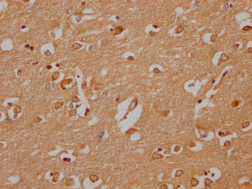 • IHC image of CSB-PA030070HA01HU diluted at 1:200 and staining in paraffin-embedded human brain tissue performed on a Leica BondTM system. After dewaxing and hydration, antigen retrieval was mediated by high pressure in a citrate buffer (pH 6.0). Section was blocked with 10% normal goat serum 30min at RT. Then primary antibody (1% BSA) was incubated at 4°C overnight. The primary is detected by a Goat anti-rabbit polymer IgG labeled by HRP and visualized using 0.05% DAB.