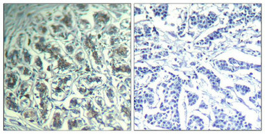 • Immunohistochemical analysis of paraffin-embedded human breast carcinoma tissue using PLC-g1(Ab-771) Antibody(left) or the same antibody preincubated with blocking peptide(right).