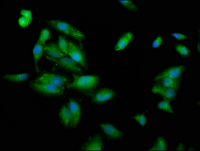 Immunofluorescence staining of Hela cells with CSB-PA619965LA01HU at 1:100, counter-stained with DAPI. The cells were fixed in 4% formaldehyde, permeabilized using 0.2% Triton X-100 and blocked in 10% normal Goat Serum. The cells were then incubated with the antibody overnight at 4°C. The secondary antibody was Alexa Fluor 488-congugated AffiniPure Goat Anti-Rabbit IgG(H+L).