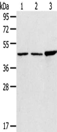 Gel: 8%SDS-PAGE,Lysate: 40 μg,Lane 1-3: 293T cells, 231 cells, Hela cells,Primary antibody: CSB-PA077536(PLIN3 Antibody) at dilution 1/800 dilution,Secondary antibody: Goat anti rabbit IgG at 1/8000 dilution,Exposure time: 3 seconds