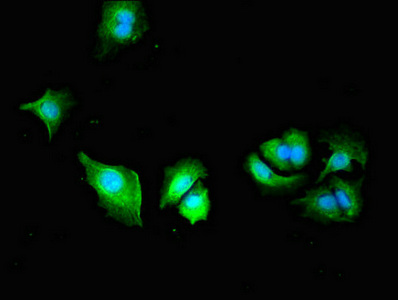 Immunofluorescent analysis of MCF-7 cells using CSB-PA018206LA01HU at dilution of 1:100 and Alexa Fluor 488-congugated AffiniPure Goat Anti-Rabbit IgG(H+L)