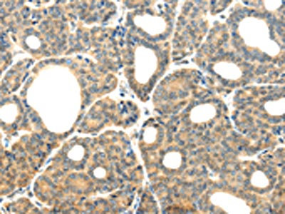 The image on the left is immunohistochemistry of paraffin-embedded Human thyroid cancer tissue using CSB-PA124601(PLXNB2 Antibody) at dilution 1/20, on the right is treated with synthetic peptide. (Original magnification: ×200)