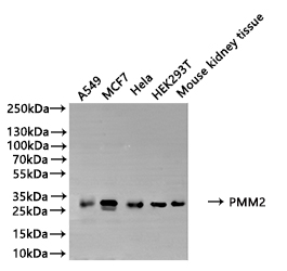 Positive WB detected in: A549 whole cell lysate(20μg), MCF7 whole cell lysate(20μg), Hela whole cell lysate(20μg), HEK293T whole cell lysate(20μg), Mouse kidney tissue lysate(20μg)