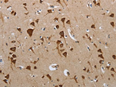 The image on the left is immunohistochemistry of paraffin-embedded Human brain tissue using CSB-PA782127(PMS2 Antibody) at dilution 1/50, on the right is treated with synthetic peptide. (Original magnification: ×200)