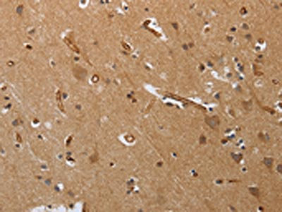 The image on the left is immunohistochemistry of paraffin-embedded Human brain tissue using CSB-PA174197(PODXL Antibody) at dilution 1/20, on the right is treated with synthetic peptide. (Original magnification: ×200)