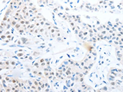 The image on the left is immunohistochemistry of paraffin-embedded Human lung cancer tissue using CSB-PA374601(POU2F1 Antibody) at dilution 1/25, on the right is treated with fusion protein. (Original magnification: ×200)