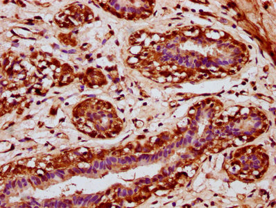 IHC image of CSB-PA018399LA01HU diluted at 1:200 and staining in paraffin-embedded human breast cancer performed on a Leica BondTM system. After dewaxing and hydration, antigen retrieval was mediated by high pressure in a citrate buffer (pH 6.0). Section was blocked with 10% normal goat serum 30min at RT. Then primary antibody (1% BSA) was incubated at 4°C overnight. The primary is detected by a biotinylated secondary antibody and visualized using an HRP conjugated SP system.
