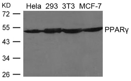 • Western blot analysis of extracts from Hela, 293, 3T3 and MCF-7 cells using PPARg Antibody.