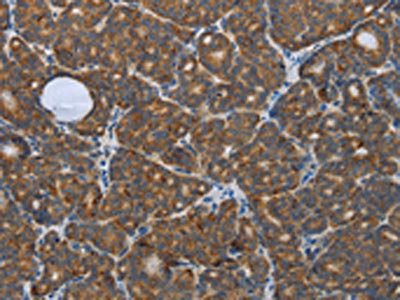 • The image on the left is immunohistochemistry of paraffin-embedded Human thyroid cancer tissue using CSB-PA053064(PPARG Antibody) at dilution 1/20, on the right is treated with synthetic peptide. (Original magnification: ×200)