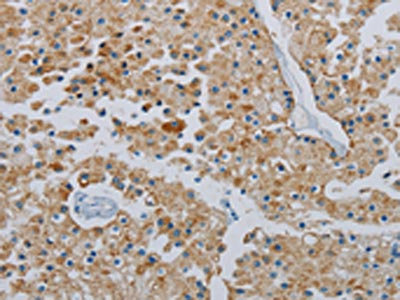 The image on the left is immunohistochemistry of paraffin-embedded Human thyroid cancer tissue using CSB-PA057249(PPARGC1B Antibody) at dilution 1/40, on the right is treated with synthetic peptide. (Original magnification: ×200)