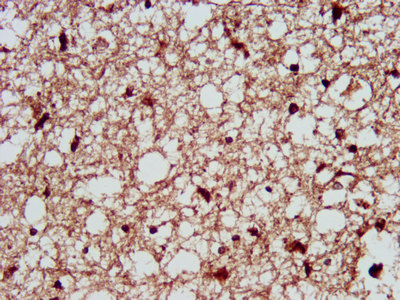 IHC image of CSB-PA890944LA01HU diluted at 1:300 and staining in paraffin-embedded human brain tissue performed on a Leica BondTM system. After dewaxing and hydration, antigen retrieval was mediated by high pressure in a citrate buffer (pH 6.0). Section was blocked with 10% normal goat serum 30min at RT. Then primary antibody (1% BSA) was incubated at 4°C overnight. The primary is detected by a biotinylated secondary antibody and visualized using an HRP conjugated SP system.